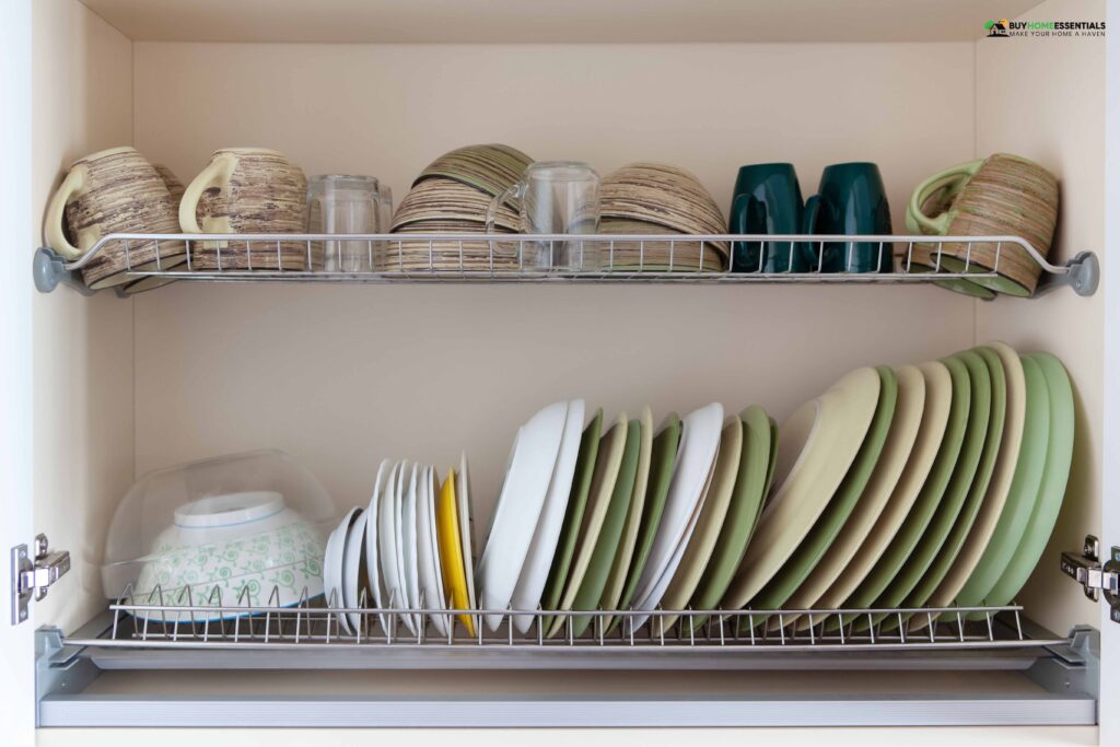 Clean dishes in white and green tones are organized in a drying kitchen cabinet.