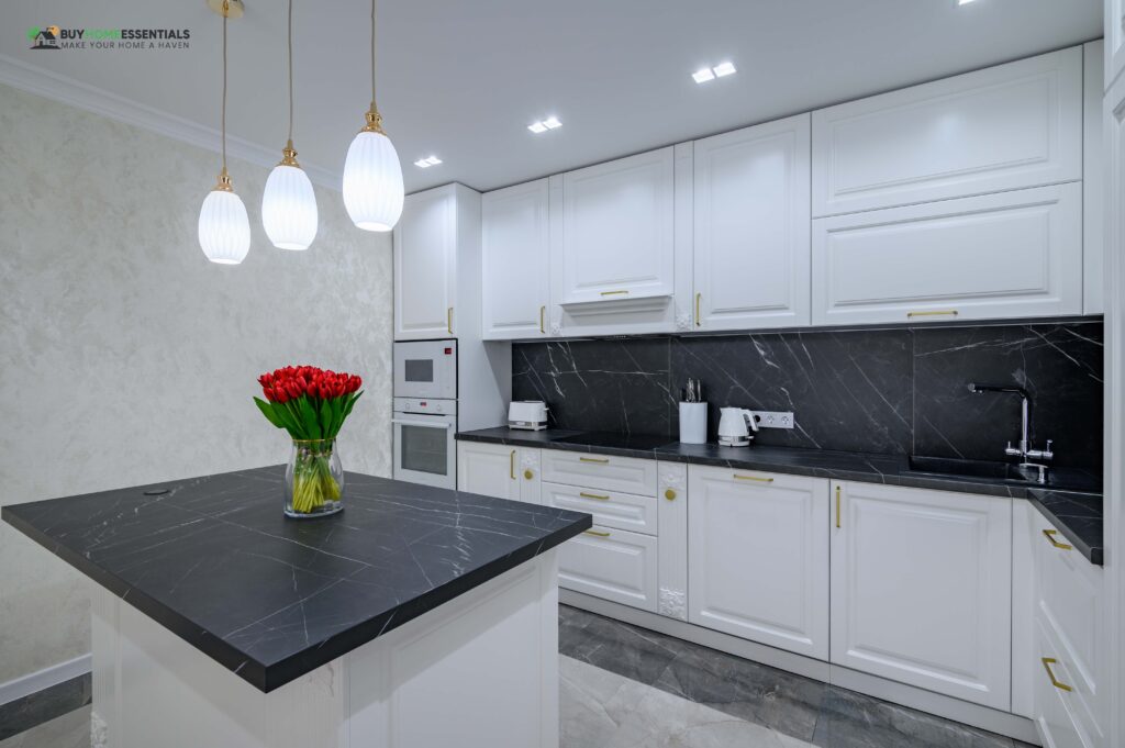 Combining classic white cabinets with black granite countertops creates an elegant kitchen aesthetic. White cabinets contrast beautifully with the deep richness of black granite, striking a perfect balance. The sharp contrast adds visual interest as well as enhances the atmosphere.