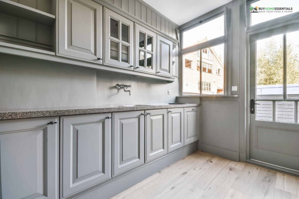 Light grey kitchen cabinets with black granite countertops create a sophisticated and versatile kitchen design. The combination creates a tranquil and balanced space that appeals to various tastes. Light gray seamlessly blends with black granite’s deep richness, creating a harmonious and elegant look.