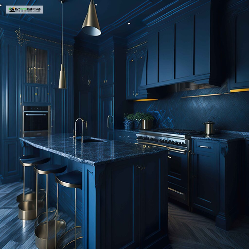 Combined with black granite countertops, navy blue cabinets create a striking high-contrast look. The dark and intense hues of both elements create a sense of depth and dimension, making your kitchen a visual masterpiece.